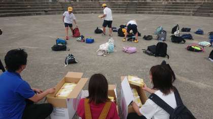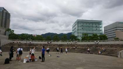 センターの見学終了後、海近くの広場で昼食です。曇り空ですが、風が涼しく、美味しく、お弁当をいただいています。