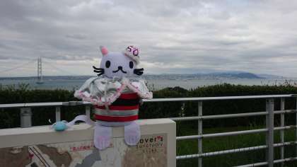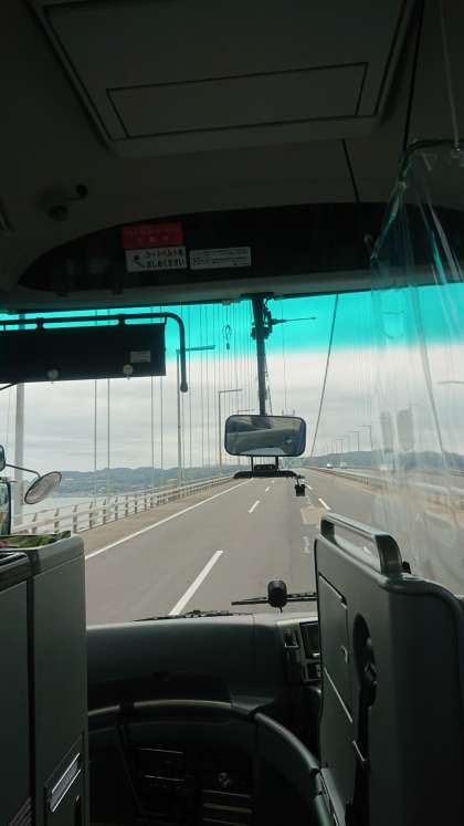 明石大橋を渡り、淡路島へ。岩屋サービスエリアでトイレ休憩とクラス写真を撮りました。50周年バージョンのニャン消しもパチリ!