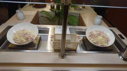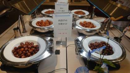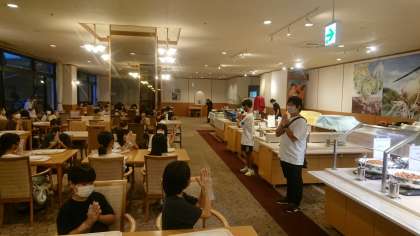 夕食はバイキングです。美味しい料理がたくさんあります。バランスよく食べましょう。