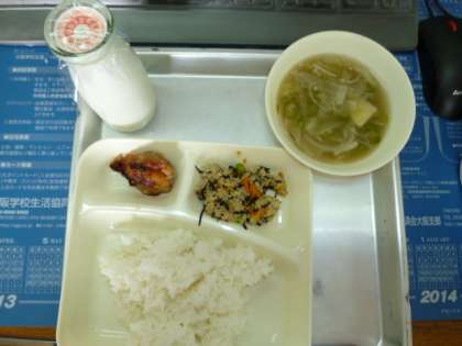 今日の献立は、ご飯、鶏肉の照り焼き、五目汁、高野豆腐の炒り煮、牛乳でした。