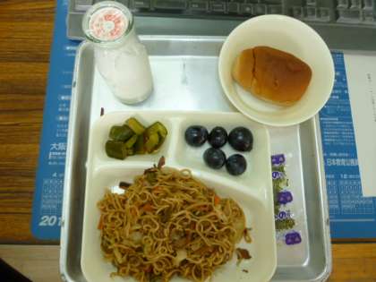 今日の献立は、2分の1黒糖パン、焼きそば、きゅうりのピリ辛あえ、ぶどう(巨峰)、牛乳でした。