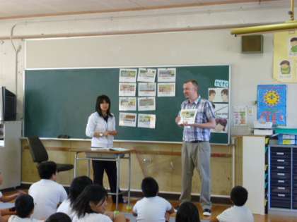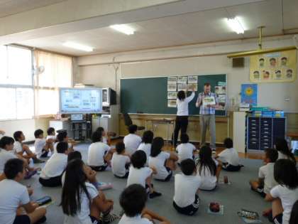 J先生と担任の先生の息も合って、授業もテンポよく進んでいます。今日は、町中にある様々な建物などの言い方を知り、日本語との違いに気づくとともに、道案内の言い方について学習しました。
