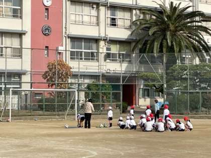 運動場でサッカーの