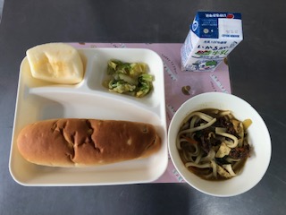 12月6日の給食は「カレーうどん・はくさいのおひたし・りんご・おさつパン・牛乳」です。どれもとても好評で、全クラス完食です。