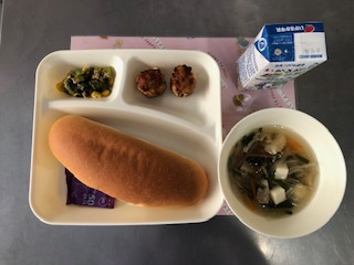 今日12月8日の給食は「あげシューマイ・中華スープ・ツナとチンゲンサイのいためもの・コッペパン・ブルーベリージャム・牛乳」です。中華スープには、たまねぎ、にんじん、もやし、にら、しいたけ。いためものにチンゲンサイとコーン。野菜たっぷりです。