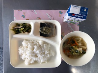 献立は「さばのみぞれかけ・すまし汁・こまつなの煮びたし・ごはん・牛乳」です。
