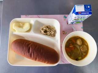 11日「ミートボールと野菜のカレー煮・ツナとキャベツのソテー・りんご・黒糖パン・牛乳」です。