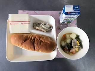 12日「あじのレモンマリネ・てぼ豆のスープ煮・スライスチーズ・おさつパン・牛乳」です。