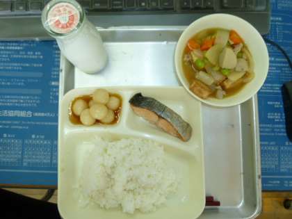 今日の献立は、ご飯、鮭の塩焼き、鶏肉と里芋の煮物、みたらし団子、牛乳でした。