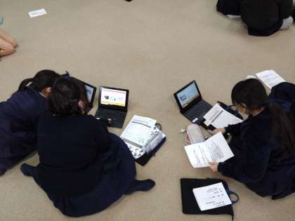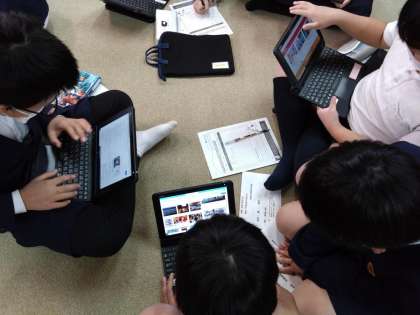 6年生は、5時間目遠足を聞いた後、情報端末でキッザニア甲子園を調べ、当日どの順番で体験するのがいいのかグループをつくり、プランニングをおこないました。
