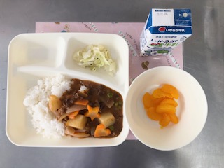 献立は「ハヤシライス・キャベツのバジル風味サラダ・みかん(缶)・牛乳」です。