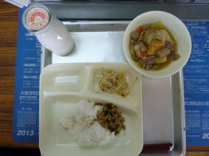 今日の献立は、ご飯、豚肉、厚揚げの煮物、もやしのゆずのかあえ、ツナわかめそぼろ、牛乳でした。