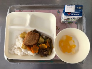 「カツカレーライス・フルーツゼリー・牛乳」です。