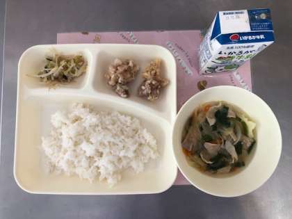 昨日の献立は「鶏肉のからあげ・中華スープ・チンゲンサイともやしの甘酢あえ・ごはん・牛乳」です。