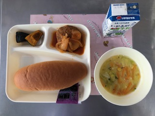 今日は「煮こみハンバーグ・コーンとキャベツのスープ・焼きかぼちゃ・コッペパン・ブルーベリージャム・牛乳」です。