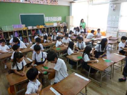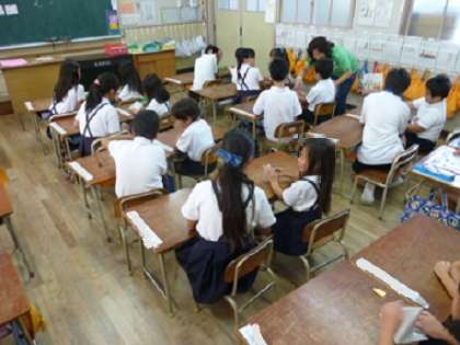 今日は、6年生が1年生に折り鶴の作り方を教え、一緒に作りました。