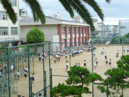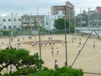 雨が止み、昼休みに運動場で遊んでいる様子です。