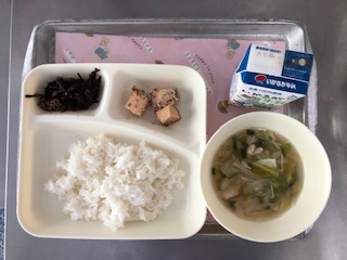 献立は「さけのごまみそ焼き・五目汁・ひじきのいため煮・ごはん・牛乳」です。