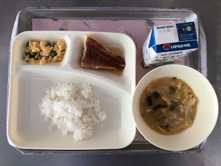 献立は「あかうおのしょうゆだれかけ・みそ汁・えんどうの卵とじ・ごはん・牛乳」です。