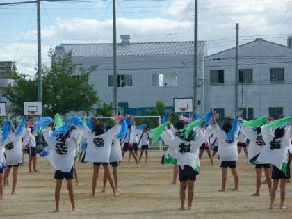 団体演技「加美北SORAN」は、三味線の音に合わせて踊るオリジナルソーランです。大きな波や大漁を体いっぱいに力強く踊ります。クラスごとに背負ったハッピの文字にもご注目ください。