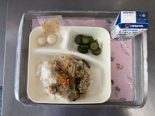 献立は「豚丼・きゅうりの梅風味・白玉だんごのきな粉がけ・牛乳」です。