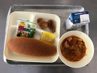 献立は「一口トンカツ・ミネストローネ・豆こんぶ・コッペパン・アプリコットジャム・牛乳」です。