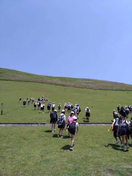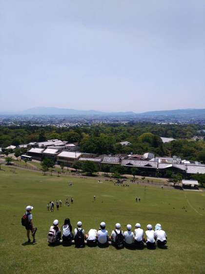 若草山で昼食です。斜面にジャーシートを敷きました。おにぎりが転がらないように。