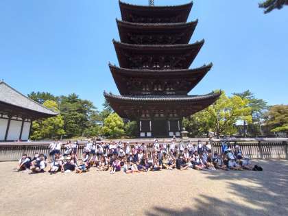 五重塔前で全員で記念撮影、奈良駅に向かい帰校しました。