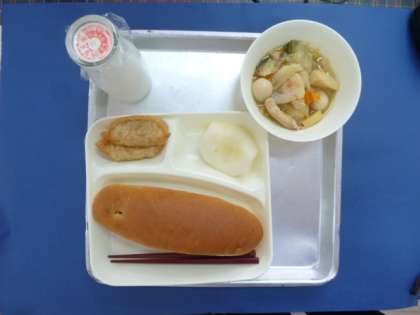 今日の献立は、レーズンパン、鶏肉と野菜のうま煮、なし、牛乳です。
