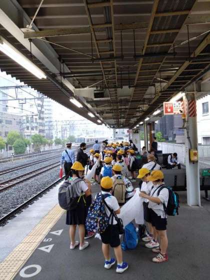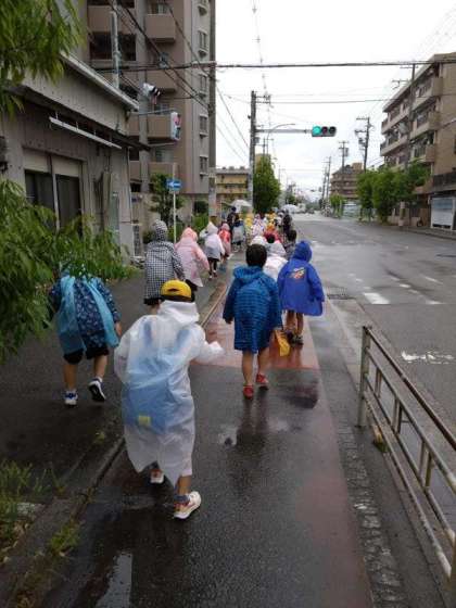 みんながんばって歩いたので予定よりも早く到着しました。レインコートはたたんでリュックの中へ。