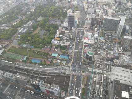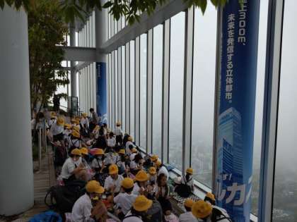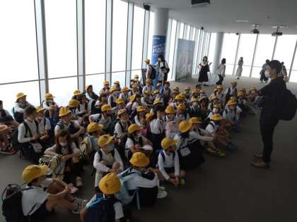 昼食後、展望台でのグループ行動の説明を聞いています。