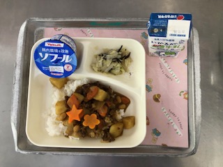 昨日の献立は「牛肉と大豆のカレーライス・キャベツのひじきドレッシング・ヨーグルト・牛乳」です。カレーライスには大豆が入っています。ドレッシングにはひじきを使っています。どちらも苦手な児童が多い食材ですが、食べやすかったので好評でした。