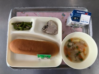 今日の献立は「かつおのマリネ焼き・スープ・グリーンアスパラガスのソテー・コッペパン・ソフトマーガリン・牛乳」です。