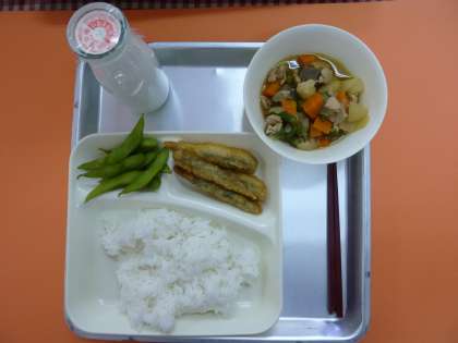 今日の献立は、ご飯、いわし天ぷら、鶏肉と野菜の煮物、枝豆、牛乳でした。