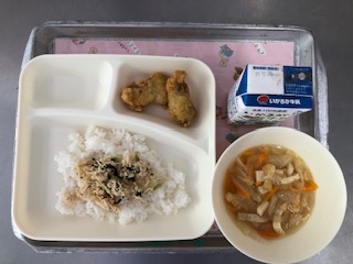 献立は「白身魚フリッター・すまし汁・とりなっ葉いため・ごはん・牛乳」です。