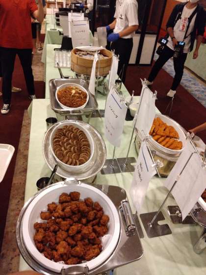 入浴、お土産買い物をすませ、夕食です。バイキングてすが、バランスよく食べましょう。