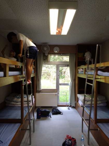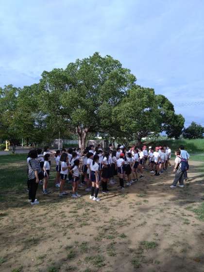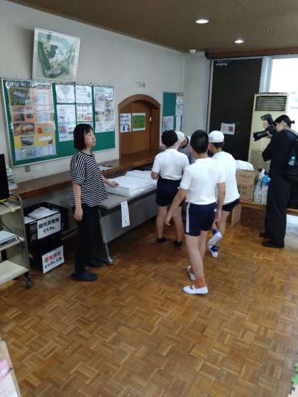 避難訓練を済ませ、シーツを持って帰ります。次はウッドペンダントづくりです。