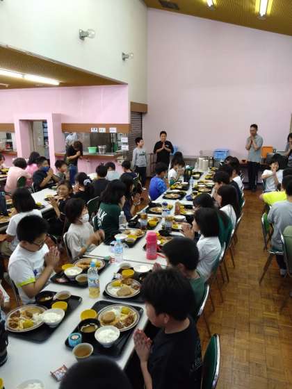 夕食です。代表児童からモリモリ食べましょうと挨拶がありました。