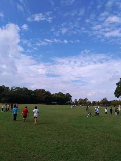 朝食後、部屋をかたづけ多目的広場にきました。虫を探したり、鬼ごっこをしたり広場一面に元気な5年生の声が響いています。