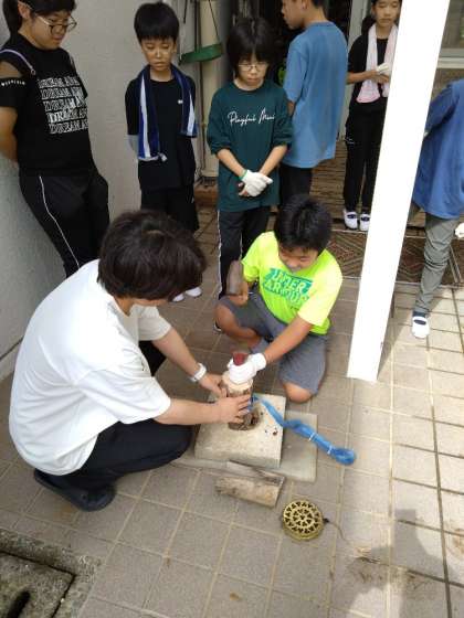 両引きのこぎり、クラッカー、くさびを使って薪割りに挑戦です。うまく割ってピザ焼きに使います。