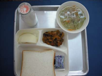 今日の献立は、食パン、ブルーベリージャム、なすのミートグラタン、鶏肉と野菜のスープ、りんご、牛乳です。
