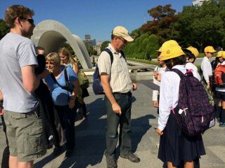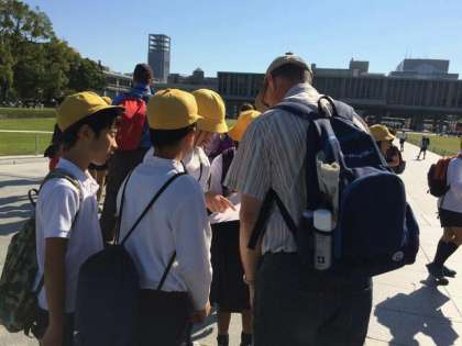 英語活動の時間に学習した平和へのメッセージをインタビューしています。