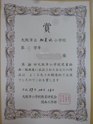 大阪市児童絵画・版画展に入選した児童に賞状が渡されました。