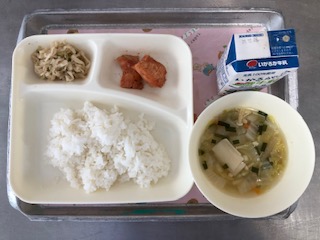 今日の献立は「鶏肉のチリソース焼き・焼き豚とワンタンの皮のスープ・切干しだいこんのごま辛みづけ・ごはん・牛乳」です。スープは焼き豚と野菜、ワンタンの皮が入った具だくさんで食べ応えがありました。
