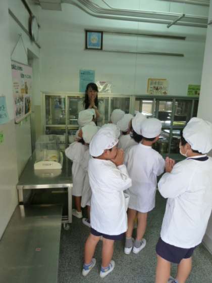 「いただきます。」と言って、給食調理員さんから受け取ります。