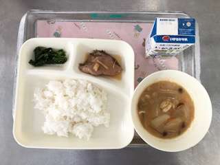 献立は「なまりぶしのしょうが煮・なめこのみそ汁・ほうれんそうのおひたし・ごはん・牛乳」です。