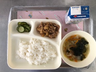 29日の献立は「豚肉のコチジャンいため・鶏肉とはるさめのスープ・きゅうりのナムル・ごはん・牛乳」です。豚肉のコチジャンいためは、豚肉とだいこんを使用し、にんにくで風味を加え、コチジャンで少し甘辛い味付けです。それにはるさめの入ったスープ、ナムルの組み合わせです。