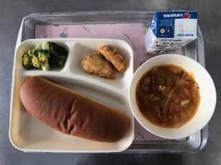 今日の献立は「白身魚フリッター・ミネストローネ・ブロッコリーのサラダ・黒糖パン・牛乳」です。フリッターは小麦粉や泡立てた卵白などで作った衣をつけて油で揚げたものです。
