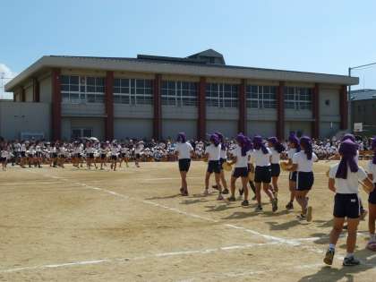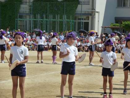 4年生の子どもたちは、「笑顔で」「足を高く上げてリズムをとり」「バチを頭の上で高く回して」10分間の激しい曲を踊りました。