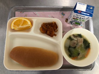 12日は「えびのチリソースいため・中華がゆ・はっさく・コッペパン・ブルーベリージャム・牛乳」です。